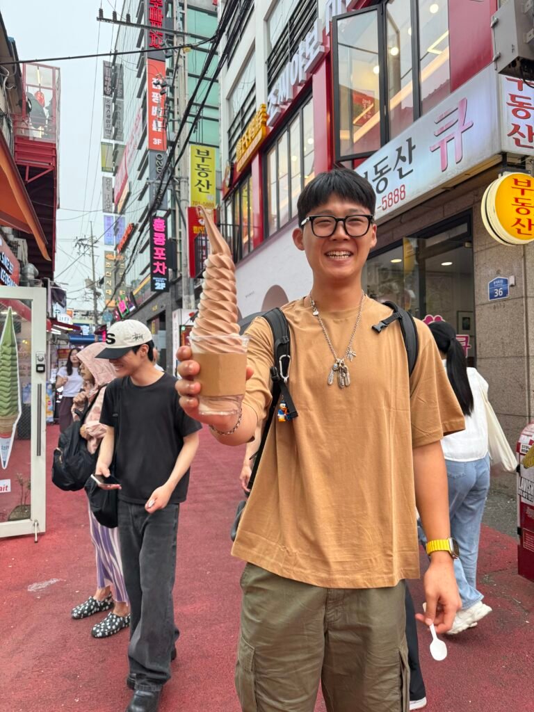 Hongdae is lively, youthful, and full of great food, bars, and shops, with brilliant connections to the rest of the city. It’s busy, but because of the excellent attention to spacial design, it never felt overwhelming, and we were there on a weekend! This was my favourite area to hang out since it did everything so well. Also, this random dude saw me filming the ice-cream and cutely said, “here, you can take a picture of mine!” Needless to say, I didn’t hesitate.